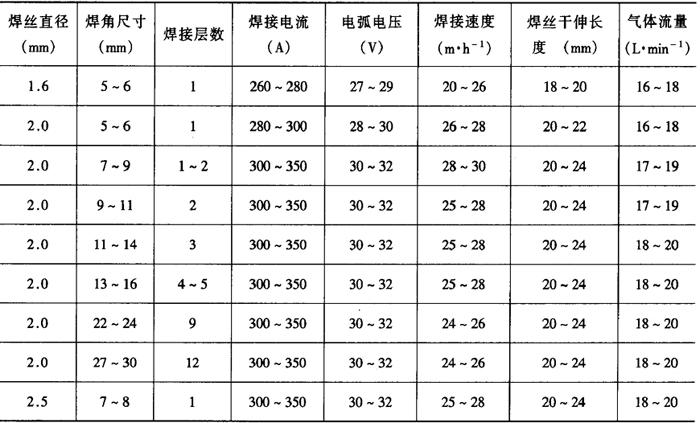 注:焊接电流小于350A时,可采用半自动焊。 表2-2-44 角焊缝二氧化碳气体保护焊焊接工艺参数[4]
