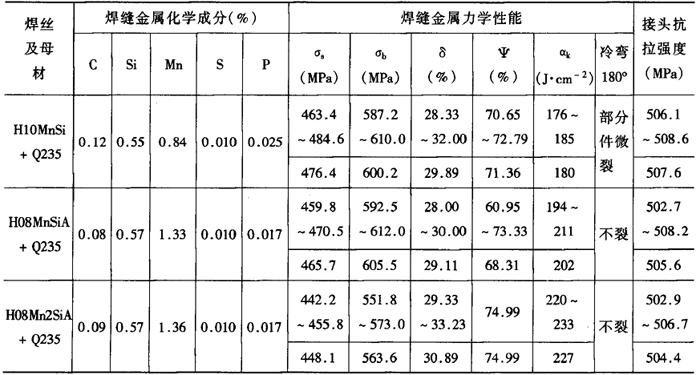 注:①焊丝间隔:350mm;焊丝角度:前倾10°; ②保护气体:内喷嘴90%Ar+10%CO2(50L/min),外喷嘴Ar(50L/min),后拖气Ar(50L/min); ③焊丝:Φ4mm。 (4)焊缝力学性能 表2-2-50给出了不同牌号焊丝焊接Q235钢焊缝金属的化学成分、力学性能及接头性能,表2-2-51为采用H08Mn2SiA焊丝焊接的焊缝及接头的力学性能。 表2-2-50 采用H10MnSi、H08Mn2SiA焊Q235焊缝金属的化学成分、力学性能及接头抗拉强度[3]