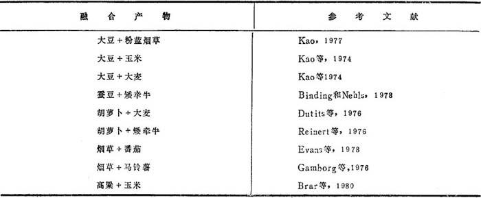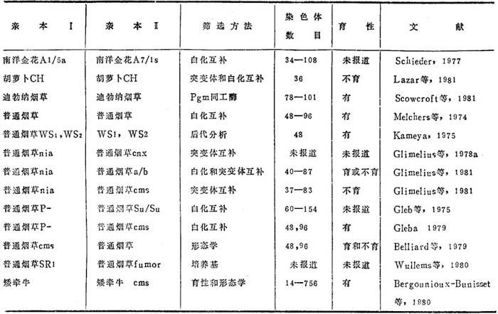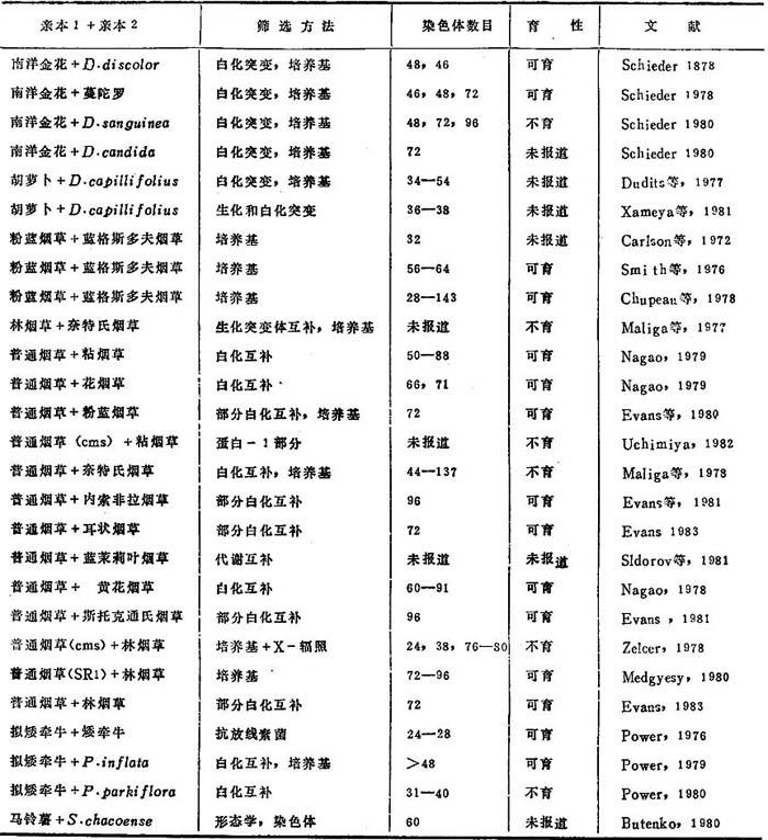 试验许多新筛选方法对鉴定种内杂种细胞的可能性。原质体系(plastome)(P-),细胞质雄性不育(cms)和核白化基因(例如,wsl,ws2,Su,Al/5a,A7/ls,s,和v)都可用作可筛选标记。如上所述,细胞培养中诱发的许多突变体也试作为可筛选标记,它包括有cnx和nia硝酸还原酶缺乏,抗cycloneximide(CH),和抗链霉素突变体(SR1)。 表6-5资料中报道了28个成功种间体细胞杂种实验。多数种间体细胞杂种是用茄科种产生的。28份报告中的18份,是用烟草属的11个种植物完成的,18个烟草体细胞杂种中的14个是用普通烟草作为一个亲本系产生的。至今通过原生质体融合有10个不同种烟草曾与普通烟草形成体细胞杂种。除烟草属外,蔓陀罗属有4个,矮牵牛属有3个,茄属有1个,它们都属茄科。仅廿八分之二是茄科以外的植物种间杂交实验。它们都是胡萝卜+D.capillifolius的体细胞杂种。因此,已报告的大量体细胞杂种,除1个例外,这种现象都限于茄科。 表6-5 种间体细胞杂种植株