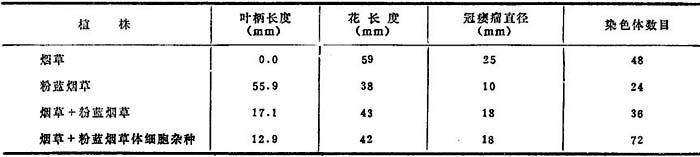 异核体的核能够融合而产生杂种,分离产生胞质杂种,或通过异步有丝分裂。Szabados和Dudits(1980)融合了一个分裂间期原生质体种与部分同步分裂中期原生质体第二个种。在产生的双核中,分裂间期核会过早地聚积,导致一些不正常染色体,假若这种现象常规地发生,那么不同细胞周期的细胞融合会导致产生异倍体。已有许多报道,植物细胞杂种中的异倍体和特殊染色体的丢失。高国楠(1977)报告过粉蓝烟草和大豆间杂种中的粉蓝烟草染色体优先丢失。爬山虎属+矮牵牛属细胞杂种丢失了全部矮牵牛染色体,和胡萝卜属+羊角芹属杂种丢失了全部羊角芹属染色体。另一方面,已产生的蚕豆属+矮牵牛属稳定杂种细胞系保留了两个亲本的染色体。 (三)杂种植株的再生方法和特性 任何两个种的原生质体都可融合在一起。然而,高等植物的体细胞杂交广泛利用受到一些限制,包括非整倍体、杂交的种障碍和不可能从原生质体再生成植株等。这些限制强调必须在植物原生质体融合方面进行更为广泛的研究。(1)主要限制是一定要使原生质体恢复再生植株的能力。已报道有几十个属的原生质再生植株。这种限制暂时妨碍了体细胞杂交在大多数重要作物改良上的应用,包括豆科和禾谷类作物。然而,豆类和禾谷类原生质再生的最近进展是鼓舞人心的,表明这种限制不是不可克服的。(2)在大多数体细胞杂种植物(包括种内体细胞杂种)中已观察到染色体的不稳定性。非整倍体杂种植物有性不育,或甚至无产生花的能力,因此不能有性繁殖。未评价过非整倍体对利用体细胞杂交种通过反复回交把有用遗传信息结合到栽培作物中去可能性的影响。(3)成功地产生体细胞杂种的种限制未充分探讨过。应仔细研究种间有性不亲和性同原生质体融合相关,以肯定它对体细胞的不亲和性的限制,即对有性杂种同体细胞杂种在合并和表达有用遗传特性能力方面进行充分的比较。还有,当我们弄清细胞质遗传和我们积累了有用细胞质遗传标记增多,体细胞杂交能用于产生独特的核质组合。于是PEG融合原生质体,能用于转移细胞质控制的雄性不育,或育种选系间其他有用的细胞质特性。 Evans等融合了粉蓝烟草叶肉原生质体和烟草的悬浮培养原生质体。用高的(1976)方法,在三个独立的实验中得到了1—10%的融合频率。当在Kao和Michayluk(1975)的8P培养基上培养原生质体,看到了细胞生长。3周后,把筛选细胞植板到含5μM6BA的固体MS培养基(1962)上。在每个实验中,皆恢复了再现推定杂种的浅绿色苗。2周时,把苗移到长根培养基上,该培养基为含25μM3-氨基吡啶的1/2MS培养基。经驯化的小植株随后移栽到温室。然而选取浅绿色植株来断定植株是体细胞杂种是不充分的,杂交是根据许多标准进行检验的(表6-3),包括了粉蓝烟草和烟草间的形态的、生化的和细胞的差别。 表6-3 体细胞和有性杂种的特征a