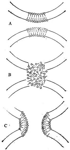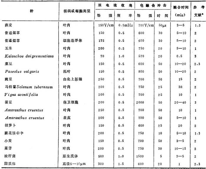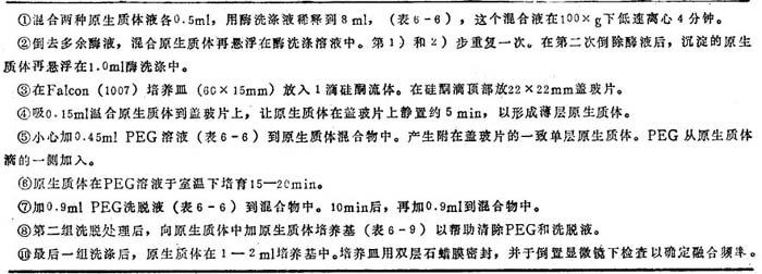图6-2 电诱导膜破裂导致细胞融合 图示电融合时,发生的分子行动模式。 A.在双向电泳过程中,使相邻质膜靠近,密切相接触;B.用单次高强DC脉冲使胞间联丝破裂(仅在细胞的二极);C.融合脉冲后,质膜修复。如果二个相邻细胞,在膜破裂时,密切靠近,脂质恢复完整双层膜,使二个细胞融合在一起。 表6-10 电刺激原生质体融合