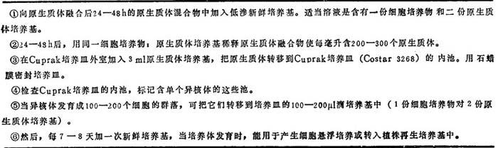 | 释义 | 体细胞杂交技术 (一)原生质体融合 当用酶法除去细胞壁时,常导致原生质体的自然融合,从而形成多核融合体。这个现象是不奇怪的,看到了胞间连丝连接植物细胞,在某些情况下,扩展而不破裂。已指出这种自然融合产物分裂和形成植株。在某些情况下,多核原生质体诱导形成范围为从南洋金花的8%到烟草的30%。这些种内多核原生质体发生同步分裂。从性细胞分离的原生质体特别容易发生自然融合。性细胞原生质体的自然融合已用于生产麝香百合和Trillium kamtschaticum的种间融合产物。 虽然已建议过几种诱导原生质体融合的方法,最早成功的是用硝酸钠。然而发生融合硝酸钠的浓度对细胞有建议的其他方法有使用盐混合物或葡聚糖硫酸盐培养基中含有Ca++离子的高pH(10.5)能有效地诱导细胞融合。已报告在低速离心混合原生质后达到25%以上的融合频率。 目前最常用的融合方法是向原生质体培养物中加入PEG(聚乙二醇)。这个方法首先是由Kao和Michayluk(1974)报道的。PEG能聚集原生质体。加25—30%高分子量PEG(1540一6000)引起原生质体的聚合作用。当用高pH和高钙离子浓度洗提时,得到了高频率原生质体融合。已报导,在某些情况下,用PEG诱导融合可到100%频率,尚未报道PEG的作用机制。已指出,PEG以一种分子桥起作用,从而离解质膜。也用其他化学药品诱导原生质体融合,如聚乙烯醇。 (二)杂种细胞的鉴定和选择 融合处理后,原生质体在液体培养基中再生细胞壁,并通过有丝分裂,导致亲本细胞的同核融合产物和异核融合产物或杂细胞的混合群体。原生质体融合产物的鉴定和恢复是基于一般观察,杂种细胞显示出隐性突变的遗传互补和体外生长要求的生理学互补(表6-1)。至今,用基于互补筛选可鉴定大多数已重现的体细胞杂种植株。Carlson等(1972)第一次成功地用互补分离出生长素自养的体细胞杂种。在两个烟草种融合后,亲本细胞生长需要生长素,而杂种细胞可在无生长素培养基上生长。生长素自养是两个亲本种的遗传互补结果的表现。 表6-1 用细胞表现型的互补或部分互补找出体细胞杂种细胞或植株a