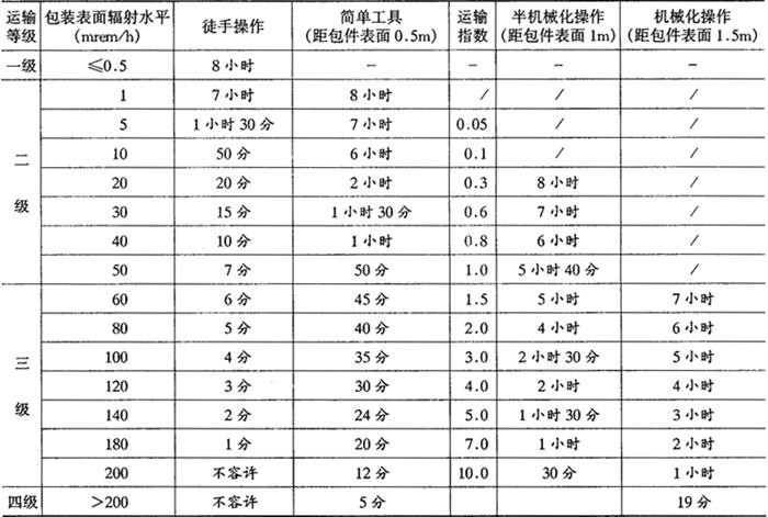 | 释义 | 储存和运输 放射性物品的主要危险性是对人体有严重的危害。对于放射性物品的包装,储存及运输要求,必须遵照国家的有关规定严格执行。 (一)包装的一般原则 放射性物品在储运过程中必须有完整妥善的包装。这是一个至关重要的问题。一般应采用四层包装: 1.内包装(内容器):放射性同位素制剂如为液体,一般使用玻璃安瓿瓶或有金属封口的小玻璃瓶,如为固体,则用带橡皮塞的小玻璃瓶或磨口瓶。若是气体,则用密封安瓿瓶。 2.内层辅助包装:指防震衬垫物,如纸,棉絮,泡沫塑料等。 3.外包装(外容器):放射α和β射线的物品,用几毫米厚的塑料或铝制罐;若系主要放射γ射线的物品,可按其能量大小,放射性活度的不同而采用不同厚度的铅罐,铁罐或铅铁组合罐。 4.外层辅助包装:如木箱,铁筒,金属箱。 总之,放射性物品的包装不得破损,不得有放射性污染。 (二)储存的一般原则 1.指定存放的仓库应干燥、通风,平坦。仓库内要划定警戒线并采取一定的屏蔽防护。插竖警戒牌和指派专人看管。 2.应远离其他危险物品或货物、人员、交通干线等,严格执行防护检查等管理制度。 3.存放过放射性物品的地方,应在卫生部门指派的专业人员监督指导下进行彻底清洁,否则不得放其他物品。 4.操作人员必须做好个人防护,应穿戴防护服、口罩、手套、胶靴。作业完毕要及时冲洗现场、换衣、洗澡,然后方可饮食。受放射性物品污染的防护服应单独清洗。 5.装卸作业前应先通风,然后再作业。装卸时轻装轻卸,严禁肩扛、背负、摔掷、碰撞、翻滚、倒放或坐在包装物上。皮肤破裂者、孕妇、哺乳妇女和有禁忌症者,不能参加作业。 6.放射性试剂剂量率小的在装载时应放在剂量率大的货物周围。 (三)运输注意事项 1.应由检查单位检查剂量后开具《放射性物品剂量检查证书》,根据放射剂量率决定运输办法; 2.车辆运装完毕应经过彻底清扫; 3.运输前如检查出包装损坏,不予运输,必要时可派专人押送。 目前,国内经营的化学试剂中,只有钍及其化合物和铀的化合物是具有放射性的,但都是天然放射性物质,其射线强度较低。根据铁道部《危规》的规定,凡是放射性比活度超过7.4×104Bq/kg的物品,都属于放射性物品。因此,当少量的铀和钍的化合物的放射性比活度未达到上述规定时,也可不列入放射性物品运输管理的范围。铁道部还规定了装卸放射性货物容许作业时间表。可作为在储存和运输方面安全操作的一种参考(见下表)。 装卸放射性货物容许作业时间表