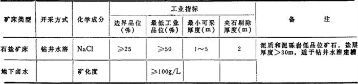 | 释义 | 储量计算 根据全国储委办公室1987年4月《矿产储量分类分级专题研究报告》和国家矿产储量管理局1988年12月《盐类矿床地质勘探规范》(征求意见稿),将工业指标和储量分类分级问题综述如下。 (-)工业指标 石盐和卤水矿床储量计算的工业指标如表3-1-14。 表3-1-14 石盐和卤水矿床储量计算的工业指标