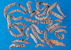 亦称“天虫”。感染白僵菌而僵死的干燥蚕体。性平、味咸,功能祛风定惊、化痰散结,主治头风头痛、喉痹咽肿、丹毒瘾疹、惊厥、瘰疬结核等。