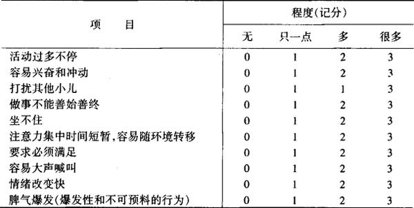 | 释义 | 儿童多动症 儿童多动症又称脑功能轻微失调、轻微脑功能障碍综合征或注意缺陷障碍,是一种常见的儿童行为异常问题,表现出与其智力水平不相称的活动过度、注意力涣散、情绪不稳定和任性冲动,1/3以上患儿伴有学习困难及心理异常。过去对这种疾病认识不足,常把这类儿童看作顽皮,常反复教育,甚至惩罚,但均不能取得良好效果。近20年才引起重视,确认为一种病态,学龄儿童发病者约占全体小学生的1%~10%。男女比例为4~6∶1,早产儿童患此病较多。 【病因】 病因多种多样,主要有以下几种: 1.遗传因素:患儿的父母和同胞中患多动症的比一般家庭为多,孪生子中单卵同病率比双卵者要高得多。 2.脑损伤:产前、产后的轻度脑损害是重要因素,主要与脑外伤、难产、早产、颅内出血、窒息和某些传染病、中毒等有关。 3.铅中毒:铅和多种重金属中毒可引起多动症。小儿少量铅的摄入常与接触塑料玩具、食品用具、油漆、含铅汽油排气、空气和水污染等有关。 4.神经活动及有关酶的问题:不少研究报告认为多动和注意力不集中可能与脑内儿茶酚胺系统(去甲肾上腺素等,其前身为多巴胺)功能不足及5-羟色胺活动亢进有关。 5.社会、家庭、心理因素:不良的社会环境、父母不和、家庭气氛紧张、家庭和学校给孩子施加过重的学习压力,均可成为本病的诱因。 【临床表现】 多动症最为常见的症状为活动过度、注意力不集中和冲动性行为,现分述如下: 1.活动过度:患儿不分场合,表现过分不安静,过多地来回跑跳,上课时不能静坐,常在座位上扭来扭去或站起,甚至离开座位走动;有时特别多嘴多舌,过度喧闹;小动作多;喜欢危险的游戏,动作冒失,过分恶作剧,富于破坏性等。 2.注意力障碍:是本症必备的症状。表现为注意力不集中或集中时间短暂,特别是上课时不专心,不遵守纪律,极易受外界影响或干扰,在家做作业及参加活动常不能坚持到最后。 3.冲动性:患儿情绪不稳而波动性大,易冲动,自制力差,容易过度兴奋,如与同学打闹或欺侮小同学,脾气急躁,常不分场合地大喊大叫。 4.学习障碍:由于注意力涣散对学习缺乏信心和毅力,而造成学习困难,成绩不佳。 5.神经发育障碍或延迟症状:如精细动作笨拙,翻掌、对指动作不灵活,系鞋带、扣纽扣动作生硬,不能分辨左右,有空间位觉障碍及其他神经系统体征。 【诊断】 多动症的诊断以病史、观察、家长和教师的陈述为主要依据,应进行综合分析。美国康纳简易多动症量表可为诊断提供参考。多动症表现计分方法见表2-4。 表2-4 多动症表现计分表
