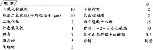 将群青、铁红、三种钛白混合,粉碎成细粉,再将四种蜡、三种酯混合,加热熔化,加入香精混合均匀后,将上述粉碎后的细粉加入,充分搅拌均匀,罐装,即为产品。