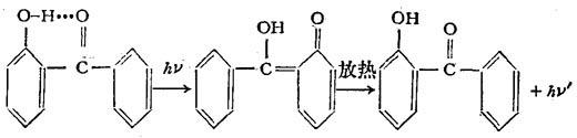 这类稳定剂的吸收波长范围宽广,在整个紫外光区域内几乎都有较强的吸收作用。它的光稳定机理一般认为是基于其结构中所存在的分子内氢键,由苯环上的羟基氢和羰基氧之间形成的分子内氢键构成一个螯合环,当稳定剂吸收紫外光能量后,分子发生热振动,氢键破裂,螯合环打开,这样就把有害的紫外光能变成无害的热能放出。此外,二苯甲酮类吸收了紫外光后,除氢键被破坏外,还可发生互变异构作用,生成烯醇式结构,这也是消散能量的一个途径。