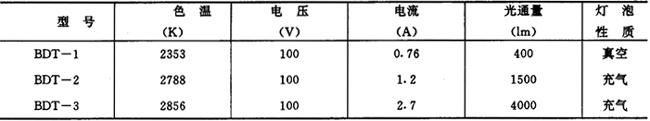 实际上都以求和来代替积分,由计算机来完成计算工作。 测量光源的I(θ,φ)用角分布光度计,光度计先用光强标准灯给以定标。经测量的光源就被赋于一个总光通量值,成为光通量副基准灯。 我国制造的光通量标准灯系列如图9.4-4所示。这种BDT型光通量标准灯是加工精细的钨丝灯,主要用于计量部门,其主要光电参数如表9.4-3。 表9.4-3 BDT型光通量标准灯光电参数