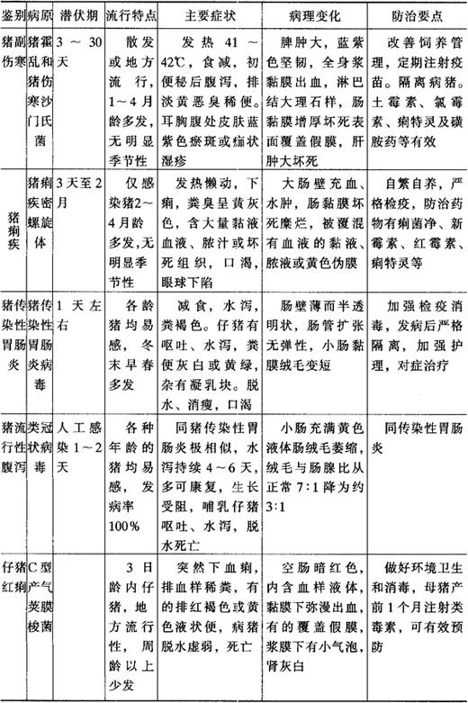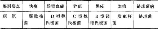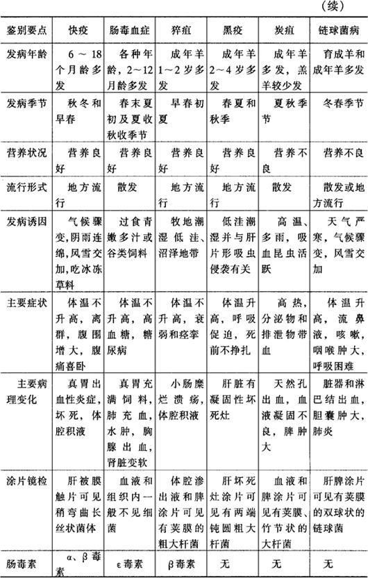 附表5 羊快疫、肠毒血症、猝疽、黑疫、炭疽、羊链球菌病的鉴别要点