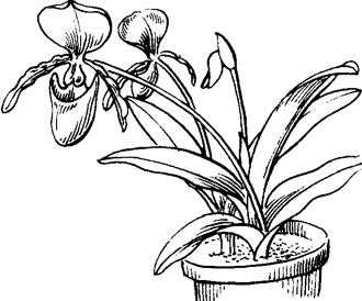 兜兰又名拖鞋兰。是世界栽培最早和最普遍的洋兰之一。花形奇特,唇瓣呈拖鞋状,花期长,每朵花开放的时间达3~5周,有冬春开花者,也有夏季开花的,一年四季都开花者少。株型矮小,耐阴性强,是最佳室内观赏花卉(图2-63)。