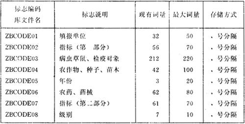 图6-2 全国植物保护专业统计信息系统结构 在“全国植物保护总站统计系统”的基础上,使用ZBTJBB可以方便快捷地建立省级统计系统。各省建立自己的系统,只需将“全国植物保护总站统计系统”中的地区标志编码ZBCODE01改为本省各地、县的编码(按国家标准)和名称,再根据本省的需要,修改或新建一些报表,即可完成。进一步,可以发展到各地、县,建立县一级的统计系统。 该系统自下而上汇总数据目前是通过软盘传递。将来有条件时,可以通过电话线路进行数据文件传输,逐步实现全国联网传输数据,自动汇总。 “全国植物保护专业统计信息系统”的建立和投入使用,必将大大提高各级植物保护统计工作的效率,使植保统计工作更加科学化、现代化。 (二)各级植物保护站统计系统的结构和组成 根据农业部制定、颁发的《植物保护专业统计报表制度》和《植物保护专业统计年度报表》设计的,由TJBB建立的“全国植物保护总站统计系统”包括:八个编码库,四个数据库,《植物保护专业统计年度报表》规定的所有报表,以及一些辅助的计算验算表和汇总后的过录表。各省(市)植物保护站统计系统与之类似。 1.标志(指标)编码库 标志(指标)编码库目录如图6-3。