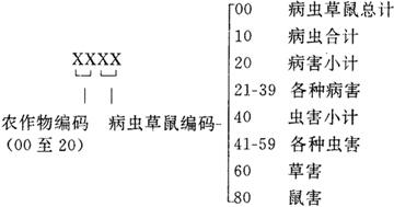 图6-3 植物保护站统计系统标志(指标)编码库目录 编码库内容(编码,名称,计量单位)详见本节三。 (1)填报单位编码(ZBCODE01) 编码规则:采用GB6620国家标准编码,码长6位,前两位是省(直辖市)编码,后4位是各区县编码。详见本节三。 (2)指标(第一部分)编码(ZBCODE02) 指标编码设计为3位编码。《植物保护专业统计年度报表》中出现的所有指标分在ZBCODE0和ZBCODE07两个编码库中。ZBCODE02中包含植专年1、2、6、7、10表中的所有指标。详见本节三。 (3)病虫草鼠、检疫对象编码(ZBCODE03) 病虫草鼠、检疫对象编码为4位编码。详见本节三。 病虫草鼠编码规则如下所示: