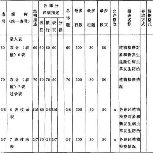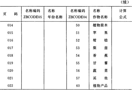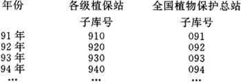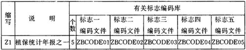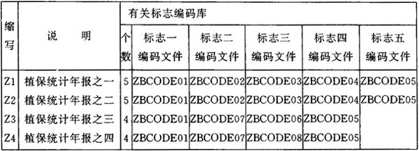 检疫对象编码规则如下所示: 2000 总计 2100 全国检疫对象合计 2101-2199 全国检疫对象 2200 地方检疫对象合计 2201-2299 地方检疫对象 2300 新发生检疫对象合计 2300-2399 新发生检疫对象 (4)农作物、种子、苗木编码(ZBCODE04) 农作物、种子、苗木编码为2位编码。详见本节三。编码规则如下所示: 00 总计 30 种子合计 50 苗木合计 60植物产品合计 01-20 农作物 31-49 种子 51-59 苗木 (5)年份编码(ZBCODE05) 年份编码为2位编码。详见本节三。 (6)农药、药械编码(ZBCODE06) 农药、药械编码为3位编码。详见本节三,其编码规则如下所示: 000 农药总计 100 杀菌剂合计 101-199 杀菌剂 200 杀虫剂合计 201-299 杀虫剂 300 除草剂合计 301-399 除草剂 400 杀鼠剂合计 401-499 杀鼠剂 500 生物农药合计 501-599 生物农药 600 其他类型药剂合计 601-699 其他类型药剂 700 中毒人数 800 药械总计 701 其中:死亡人数 801-899 药械 (7)指标(第二部分)编码(ZBCODE07) 指标编码设计为3位编码。《植物保护专业统计年度报表》中出现的所有指标放在ZBCODE02和ZBCODE07两个编码库中。ZBCODE0 7中包含植专年3、4、5、8和9表中的所有指标。详见本节三。 (8)级别编码(ZBCODE08) 级别编码为2位编码,详见本节三。 2.统计数据库 各级植保站统计系统均包含如下四个数据库: Z1 植保统计年报之一,包含农计(农植)1、2、10表 Z2 植保统计年报之二,包含农计(农植)6、7表 Z3 植保统计年报之三,包含农计(农植)3、4、5表 Z4 植保统计年报之四,包含农计(农植)8、9、11表 每个数据库都按年份分为若干子库,每个子库由一个子库号标识,各年的子库号如下所示: