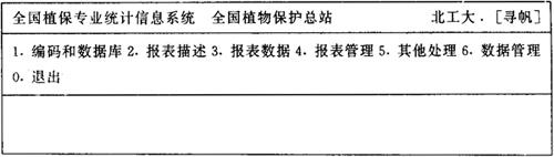 图6-4 全国植物保护专业统计信息系统主菜单 2.基本操作 所有菜单项目可用←→键选择然后按ENTER键执行,也可直接键入菜单项目前面的数字来选择执行。 3.选择数据库 使用TJBB处理报表(主菜单2-5项)前,必须首先指定当前数据库。系统启动时,可自动将上一次最后使用的数据库作为当前数据库。如果想换另一个数据库,应选择主菜单中的“1.编码和数据库”,再选该子菜单中的“6.查选统计数据库”,这时屏幕出现图6-5所示的数据库目录: