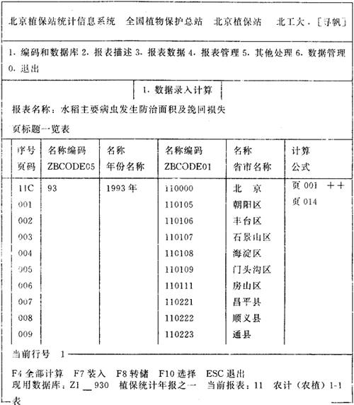 图6-6 北京市植物保护站统计系统1-1表的“页标题一览表” 5.报表公式计算 定义在数据录入表上的行列公式可在数据录入或修改后按F4键进行计算,或退出时自动计算。辅助计算表应在数据录入修改完成后,依次进入逐一计算(进入后按F4键)。在全国植物保护总站统计系统的数据库Z1中定义了如下6个辅助计算表,其计算功能说明如下: (1)农计(农植)1-15表的辅助计算表(1G)。该表计算1-15表的“挽回粮食损失”和“实际粮食损失”两栏。 (2)农计(农植)1表的辅助计算表1(C1)。该表计算1表的“发生面积”和“防治面积”两栏。 (3)农计(农植)1表的辅助计算表2(C2)。该表计算1表的“挽回粮食损失”和“实际粮食损失”两栏。 (4)农计(农植)1表的辅助计算表3(C3)。该表计算1表的“发生程度”栏。 (5)农计(农植)1表过录表的辅助计算表(G0)。该表计算1表的过录表的第一行的“发生程度”。对于全国植物保护总站,这个第一行是“全国”那一行,对于省(市)级植物保护站,这个第一行是XX省(市)那一行。 (6)农计(农植)10表的辅助计算表(GB)。该表将1表的“病虫害合计”的“发生面积”复制到10表的“受灾面积”。 各省级植物保护站的数据库Z1中除包含以上辅助计算表外,可能还有其他辅助计算表,都应该逐一计算。 6.报表汇总计算 当各区县的数据录入和计算完成后,便可进行全省(市)汇总。 选择主菜单中的“3.报表数据”,再选该子菜单中的“3.同表页间计算”,这时屏幕出现当前数据库的报表目录。将光标移动到需要汇总的报表条目上,按F10键后屏幕上出现如图6-6所示的“页标题一览表”,再将光标移到XX省(市)那一行,(对于北京植保站是“北京”那一行,对于全国植保总站是“全国”那一行),按F10键,屏幕上即出现该页报表。然后按F4键进行页累加运算。 Z1至Z4四个数据库中的每一个数据录入表都应进行这种页运算,而辅助计算表和过录表不需要做这一步。 7.报表打印输出 类似数据录入计算,选择菜单4.1项“报表打印输出”后,屏幕上将出现报表目录。选择其中一个报表后,屏幕上会出现该表的页标题一览表,再选择所需的一页,该表那一页就会显示在屏幕上。 在打印之前可以对报表按某些栏排序,可以删除全零数据行以及设置打印参数(字体字号等)。报表可直接打印,也可按打印格式存盘。 8.上报数据提取 由于各省(市)统计数据库中包含各区县的数据,因此不能把这个数据库直接上报,应该从上级要求的全部报表中提取出省(市)的那一页形成一个上报数据库。为保证上报数据的准确无误,植保总站统一规定不准从本省(市)统计报表系统(即子目录??ZB93)中直接提取数据,应该把本省(市)数据库复制到子目录\ZB93\TJBB_DAT中,然后启动TJBB,进入ZB93后,再进行上报数据提取。以北京植保站为例,在启动TJBB之前,先用如下操作系统命令复制数据库(应有文件名形式为Z?_930.ST?的12个文件被复制)。 COPY\BJZB93\TJBB_DAT\*.*\ZB93\TJBB_DAT\*.* 然后再启动TJBB,选择主菜单中的“4.报表管理”,再选该子菜单中的“2.报表数据提取”,这时屏幕上出现如下子库号询问(假设当前数据库为Z4): 提取的报表数据存入统计数据库Z4____?中(不能与当前数据库号相同) 新的数据库名与原数据库名相同,只是子库号不同。全国植保专业统计信息系统规定各级植保站上报数据库的子库号如下表所列,前两位是地区编码,第3位A、B、C…与年份1991、1992、1993…相对应。按上述规定,北京1993年上报数据库子库号应回答11C。