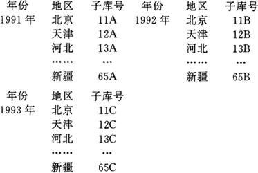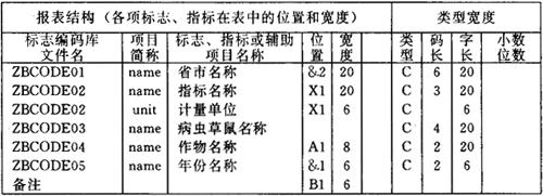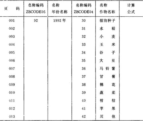 图6-12 TJBB的统计报表结构三维图 (5)统计报表汇总 在TJBB中,从本部门统计报表中提取需要上报的报表数据称为报表数据提取。将下级单位填报的由上级机关统一制发的统计报表中的数据汇集在一起,称为报表数据汇集。统计报表汇总是通过下级单位数据的提取和上级机关数据的汇集两步实现的。 2.标志编码和编码库 为了统计信息的规范化、标准化和便于计算机处理,对于统计报表中出现的每一种总体单位、分组标志或指标的名称必须一一进行编码,我们统称为标志编码。例如图6-16所示的四种编码一览表。有些名称需要注明计量单位或附加其他说明,这些应该与名称列在一起,例如图6-16中的各种指标编码表。 一种或若干种标志的名称编码一览表构成标志编码库。TJBB提供了建立以及管理各种标志编码库的功能。 3.统计数据库 TJBB中的一个统计数据库可以看成是一组相关的统计表的集合。数据库的逻辑结构与构成这组统计表的指标体系和分组体系相对应,用户只需指定与这组报表有关的全部标志或指标编码库,即可建立统计数据库。数据库中的数据就是由这组标志或指标所限定的全部指标数值。TJBB允许建立多个统计数据库。 4.统计报表与统计数据库的关系 TJBB的统计报表是TJBB统计数据库的直观表示。统计报表中的数据被页标题、横行标题和纵栏标题所限定。这些标题的各标志(或指标)名称的组合唯一地决定了统计数据库中的数据,当各标志改变位置构成另一个统计表时,这个表中的数据与某些原有表中的数据可能是同样的。因此,在TJBB的统计报表中,出现在不同表格中的同一数据只需在一个表中录入计算,其他可从统计数据库中自动检索出来填入报表中。这实际上保证了不同报表中相关数据的一致性,也代替了某些统计资料的整理和汇总工作。 例如我们从农计(农植)1-15表录入数据并计算之后,其中“农田草害合计”和“农田鼠害合计”两行的数据会自动出现在农计(农植)1表的相应行中。 水稻病虫发生、防治面积及挽回损失 1992年 水稻病虫合计 例表2