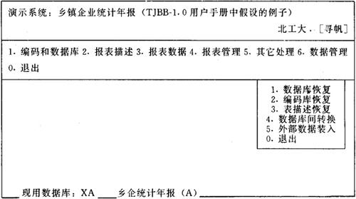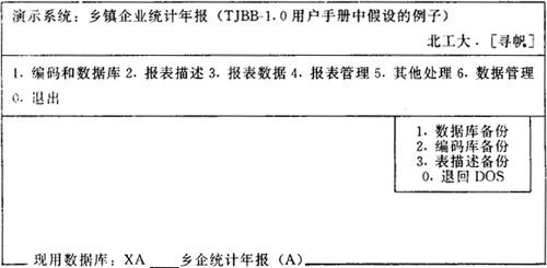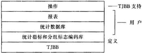 图6-9 报表数据管理子菜单 其中前三项为数据恢复,与数据备份一一对映,功能类似,只是方向不同,它将备份盘上的备份文件又恢复到当前用户子目录中,操作与数据备份基本相同。不再详述。 二、“统计报表自动处理系统TJBB”入门 (一)TJBB是构造专用统计系统的快速、有效工具就统计工作而言,各行业、各部门都有自己的统计指标体系和相应的分组体系,从而形成了各自不同的统计系统。各种不同形式的报表既是统计工作处理的主要对象,又体现了统计工作的最后成果。所以,各统计部门都根据自己的需要,制定一整套的统计报表制度。由于形势的变化和不同的需求,统计的内容、指标和报表的式样经常会发生变化。这样,一些专用的计算机统计系统就很难适应这些变化,给统计人员带来了不方便。如果要适应这些变化,就得修改程序,又给程序员带来了不方便。 以改变上述的两个“不方便”为目的而设计、开发的“统计报表自动处理系统TJBB”,是直接面向最终用户——统计工作人员的。各专业的统计人员根据自己的需要,应用TJBB可以建立、修改、使用自己专业专用的统计指标、统计数据库和统计报表,从而形成本专业专用的计算机统计系统。 TJBB的最大特点是:按照统计人员的描述,可以自动的建立统一的数据库和形成各种不同式样的报表。所有这些工作,不需要编制任何程序。可以说TJBB为广大统计人员直接参与设计、开发实用、高效的计算机专用统计系统,充分发挥自己的聪明才智提供了一个广阔的舞台。 用TJBB建立起来的专用统计系统的结构如图6-10。