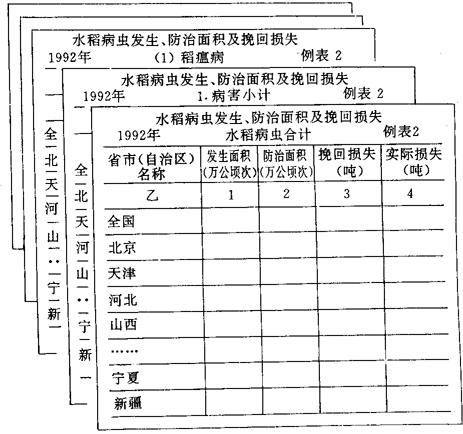 图6-11 TJBB的统计报表结构 总标题:不仅指报表名称,而是包括表头表尾中的所有文字。例如图6-11中的“填报人”“日期”等,还可以有其他说明,如页码等。 横行标题和纵栏标题:可分别由一种或多种分组标志或统计指标平行或复合构成。纵栏较多时,为便于阅读,通常附加纵栏序号。 页和页标题:TJBB所处理的统计报表是自上而下颁发,然后自下而上填报的一组统计表。因此,汇总上来的每一种统计表将有多页(通常每个填报单位为一页)。每一页可以有页标题说明,页标题可以是分组标志,例如,填报单位,或统计指标,也可以是它们的复合,例如,年份和填报单位。 综上所述,TJBB中的统计表实际上是一个可以表示多维数据的三维表。如图6-12所示。 (2)数据和计算公式 TJBB报表中的数据,有一部分为原始数据,另一部分是根据某种计算公式由原始数据计算产生的。例如图6-11例表1中的“1.病害小计”、“2.虫害小计”和“水稻病虫合计”都是其他一些行的和。 TJBB中的计算公式有行公式、列公式和页公式。TJBB提供了原始数据录入、修改以及根据已定义公式对表中数据进行计算或验算的功能。 (3)表间配平关系 在一组统计表中,某个表中的某些数据可能与另一个表中的某些数据有关。例如农计(农植)1表中的“病虫害”的“发生面积”应该等于10表中的“受灾面积”,1表中的“病害小计”(或“虫害小计”)等于1-1表至1-14表中“病害小计”(或“虫害小计”)的和(见附录1-8)。这种关系我们称为表间配平关系。TJBB可以保证这种表间平衡关系。 (4)页运算(累计等) TJBB提供了同种表多页间连加、连乘以及两页间的各种算术运算。例如:“全国”=“各省市”数据的累加(形成俗称的“穿刺表”,如图6-12所示)。