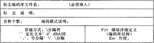 图6-16 编码库建立填空窗口 如果要建立填报单位编码库ZBCODE01,填写内容如图6-17: 其中“文件名”和“名称个数”必须填入。存储方式可选四种:空格分隔定长、逗号或反斜线分隔变长ASCII文件以及DBASE库文件。可键入空格、逗号、反斜线或字母d来选择相应的方式。其中‘\’分隔为省缺方式。