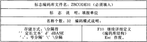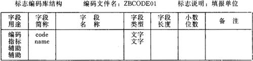 图6-18 编码库结构定义表 填报单位编码库ZBCODE01的结构应按图6-19所示填写。 标志编码库结构 编码文件名:ZBCODE01 标志说明:填报单位