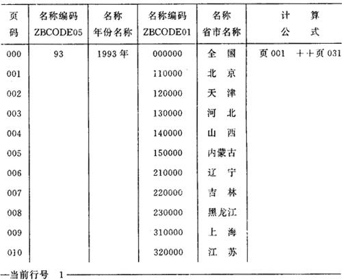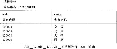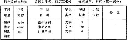 图6-20 各种指标编码库结构定义 (3)录入、修改编码和名称 编码库结构定义好退出之后,新定义的编码库将出现在TJBB编码库目录中,选择菜单1.3项“增改删标志编码”,在所显示的编码库目录中选择一个,例如选择ZBCODE01,按F10键即可进入如图6-21所示的编码表录入修改屏幕了。