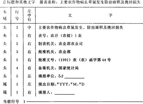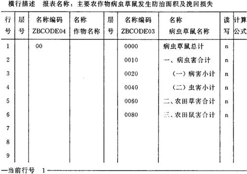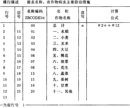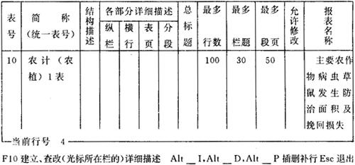 图6-32 农计(农植)2表的表头样式 (4)横行标题描述 在报表目录中,将光标移至所描述表的“横行”栏中,按F10键,这时屏幕将出现如图6-33式样的横行描述空表。农计(农植)2表的横行描述填写如图6-33。
