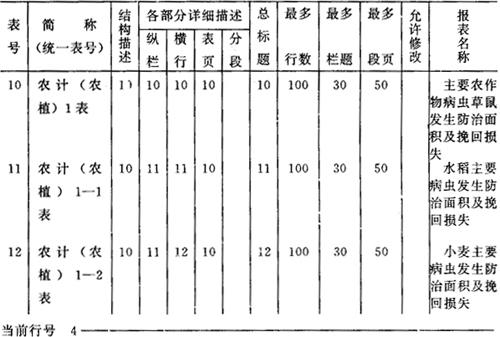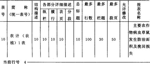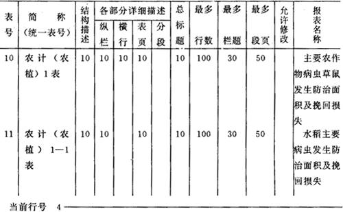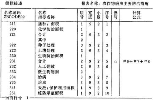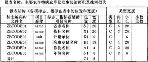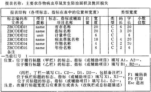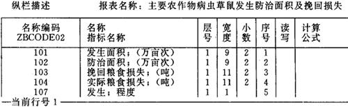 图6-26 农计(农植)1表的结构描述 一种统计表不一定涉及结构描述窗口中所显示的全部标志或辅助项目。不在表中使用的其位置栏可为空。例如农计(农植)2表中“病虫草鼠名称”编码的位置码为空,如图6-27所示。 报表名称:农作物病虫主要防治措施