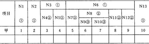 图6-30 多层嵌套纵栏标题层号 纵栏标题中出现的所有标志名称及相应编码应按层次结构从左至右从上至下的顺序填入编码和名称栏。例如图6-30所示的纵栏标题,应按N1至N13的顺序填写。 实际上,我们只需在编码栏键入编码,系统会自动将编码库中对应的名称(包括所需要的计量单位等辅助项目)在名称栏显示出来。如果认为文字不妥,还可直接修改。 层号栏应填写各标志(或指标)名称在纵栏标题中的层号。层号范围是1至9。 宽度和小数是指某栏数据的宽度和小数位数。不是最底层的纵栏标题,不直接对应数据,不需要规定宽度。 如果纵栏标题文字太长,使得栏目太宽,我们可在文字中间加分号,纵栏标题生成时会自动从分号处分行,例如图6-28、6-29所示农计(农植)1表的纵栏描述和表头样式。 图6-31是农计(农植)2表的纵栏描述和表头样式。