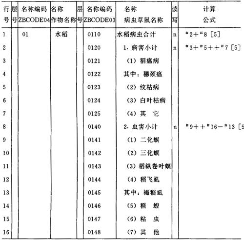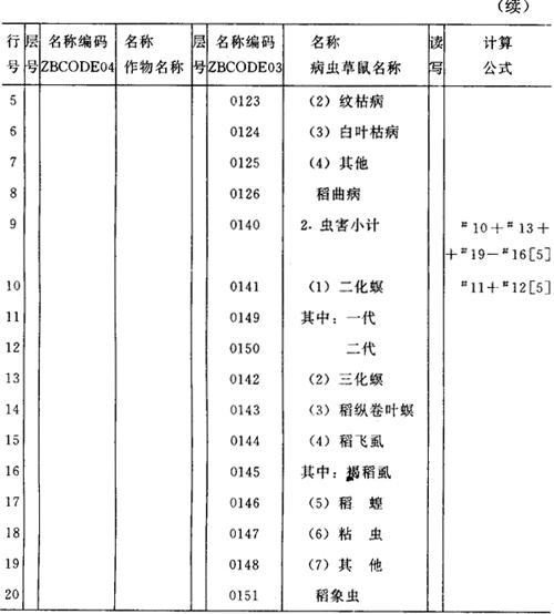 图6-47 农计(农植)7表的过录表的页标题描述 (四)如何把“全国植物保护总站统计系统”改造为本省(市)植保统计系统 把“全国植物保护总站统计系统”改造为适用本省(市)的统计系统是很方便的,主要工作是下述的第1步,其余两步可根据需要进行。 1.修改填报单位 (1)将“填报单位”编码库(ZBCODB01)中的单位改为本省(市)所属的填报单位(如地、市、盟或县、市、区、旗)。如果填报单位较多,原设置最大编码名称个数不够,应先修改编码库目录中的这个最大值(在“编码和数据库”子菜单中选择“增改删标志编码”后出现的编码库目录)。 (2)修改数据录入表的页标题 将数据录入表的页标题描述全改为本省(市)各填报单位的代码和名称。如果填报单位较多,应先修改报表描述录中的“最大段页”数(其省缺值为50)。 (3)修改过录表的横行标题 通常过录表的横行标题为“填报单位”,因此也应将它们改为本省(市)的各具体填报单位。 2.修改部分报表内容 如果本省(市)报表中有新增减项目,一般应进行如下三步操作。 (1)增加编码 如果报表中新增一些项目,首先要设计它们的编码并加到有关编码库中,注意新增编码不能与原有编码重复。例如北京市植物保护站农计(农植)1-1表中“二化螟”下面增加“其中:一代”和“二代”,因此我们在ZBCODE03编码库中增加了“0149,其中:一代”和“0150,二代”两条。 (2)增减报表项目 进入要修改的纵栏、横行或(过录表)表页描述进行修改即可。例如图6-48所示,北京市植物保护站农计(农植)1-1表的横行标题,有关的过录表的页标题也应修改。 (3)修改计算公式 因为原全国植物保护总站定义的报表中许多公式与行号有关,如果我们增减一些行,公式也要相应修改。例如北京市植物保护站的1-1表的横行公式改为如图6-48所示(原植物保护总站1-1表的横行公式见图6-35)。 3.增加辅助计算 有些报表修改后使得原全国植物保护总站报表中的一些项目无法直接对应。例如北京市植物保护站的花生病虫害(1-8表)中增加了“(3)棉铃虫”,原“(3)其他”改为“(4)其他”。在全国植物保护总站的报表中的“(4)其他”应等于北京市植物保护站的“(3)棉铃虫“+”(4)其他”。这两个“其他”不应用统一编码。它们的计算关系可附加到报表中(在北京市植物保护站1-8表中增加一行。“其他(全国)”并定义体现上述关系的公式)或单设一个辅助计算表。