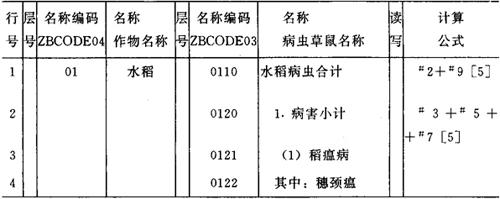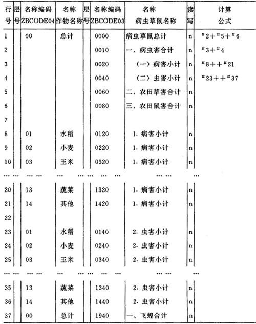 图6-42 数据库Z1部分报表定义完成后的报表描述目录 (8)表间配平关系 表间配平关系主要有以下两种情况。 ①不同报表中的同一对象。例如农计(农植)1表中“农田草害合计”与农计(农植)1-15表中的“农田草害合计”是同一对象,“农田鼠害合计”也是如此。为保证两表的一致,定义报表时,同一对象应使用同样编码。农计(农植)1表和1-15表的横行标题描述的“农田草害合计”和“农田鼠害合计”都使用编码“0060”和“0080”。这样可以保证从1-15表录入计算的这个合计自动出现在农计(农植)1表中。 表1到表10