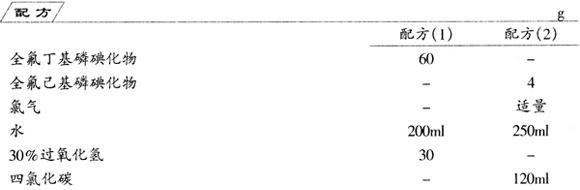 配方(1):把全氟丁基磷碘化物放入水中,搅拌数小时后,待碘化物消失,滤去不纯物,在搅拌下滴加过氧化氢,此时元素碘以结晶形式析出。然后过滤,澄清,溶液因含有溶解碘而呈浅褐色。蒸发浓缩除去溶剂,残留物为全氟丁烷磷酸和双全氟丁烷磷酸酯的混合物25g。产品有强酸性,具有表面活性,外观为无色块状。