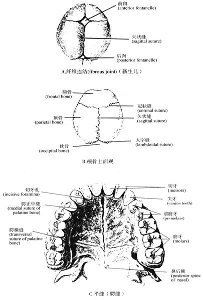 图3-4 直接骨连结(A~C) (三)上肢骨 左右对称,两侧共有锁骨(clavicula)(2)、肩胛骨(scapula)(2)、肱骨(humerus)(2)、桡骨(radius)(2)、尺骨(ulna)(2)、腕骨(carpal bones)(16)、掌骨(metacarpal bone)(10)和指骨(phalanges of fingers)(28)组成(图3-1)。 (四)下肢骨 同样为左右对称,两侧共有髋骨(hip bone)(2)、股骨 femur)(2)、髌骨(patella)(2)、胫骨(tibia)(2)、腓骨(fibula)(2)、跗骨(tarsal bones)(14)、跖骨(metatarsal bone)(10)和趾骨(phalanges of toes)(28)组成。髋骨一般16岁前由髂骨、耻骨和坐骨组成,三骨之间由软骨结合(图3-1E),16岁后软骨逐渐骨化才融合为一骨(图3-1)。