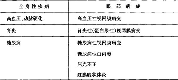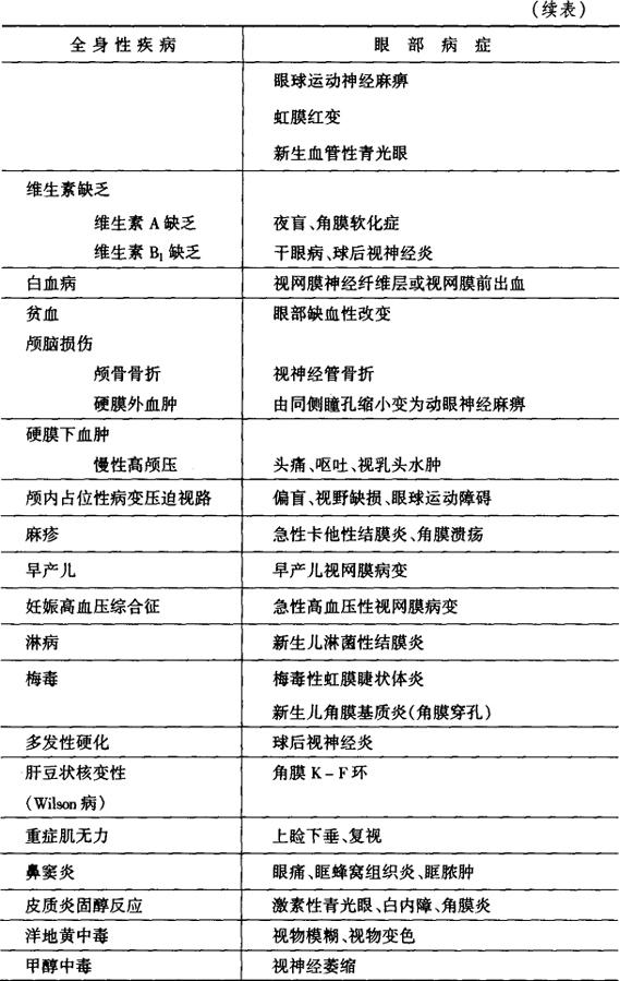 | 释义 | 全身疾病的眼部表现 许多全身性疾病可导致眼部功能性或器质性损害,甚至失明。因此,掌握一些常见的全身性疾病的眼部病症表现,对做到让患者早期有目的的检查,采取必要的预防措施,防止恶性预后的发生非常重要。常见的全身性疾病及其眼部病症见表3-4。 表3-4 常见的全身性疾病及其眼部病症一览表