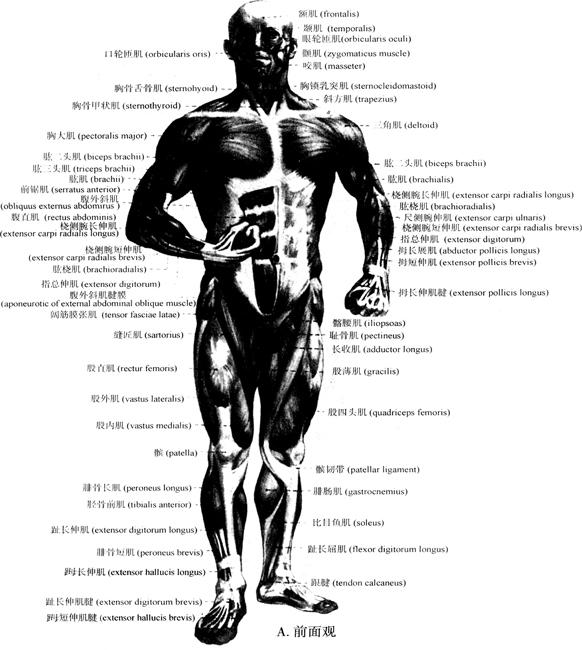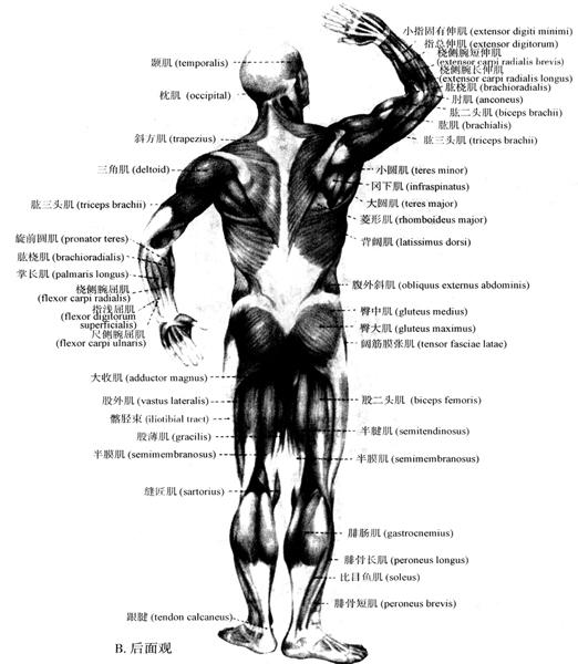 | 释义 | 全身肌的分布 身体各个部位肌的分布如图3-18A、B所示。 (一)躯干肌 躯干肌包括背肌(muscles of back)、胸肌(muscles of thorax)、膈肌(diaphragm)和腹肌(muscles of abdomen)(图3-18A)。