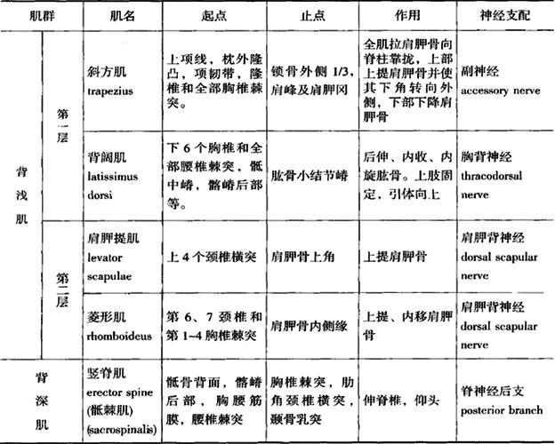 图3-18 全身肌肉(A) 1.背肌 分浅、深两群,浅群多为阔肌,主要有斜方肌(trapezius)、背阔肌(latissimus dorsi)、肩胛提肌(levator scapulae),深层为竖脊肌(erector spinae),见表3-1(图3-18B)。 表3-1 背肌