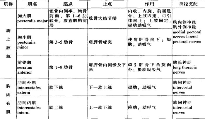 图3-18 全身肌肉(B) 2.胸肌 一部分起自胸廓,止于上肢骨,称为胸上肢肌。其中最大块的胸大肌(pectotalis major)位于前胸壁的浅层,覆盖胸廓前壁的大部。主要的胸上肢肌有胸大肌(pectotalis major)、胸小肌(pectotalis minor)、前锯肌(serratus anterior)。另一部分起、止均在胸廓上,如肋间内、外肌,称为胸固有肌,见表3-2(图3-18A)。 表3-2 胸肌