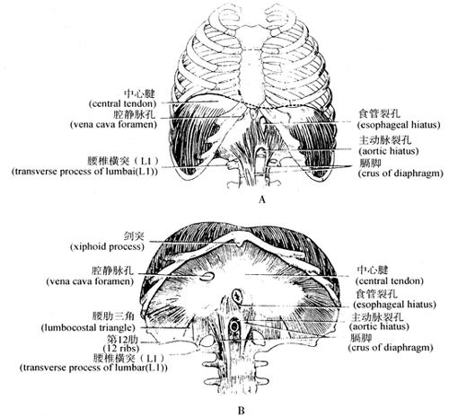 3.与呼吸有关的肌肉膈和肋间肌 (1)膈肌(图3-19):膈(diaphragm)为分隔胸、腹腔的一块阔肌,向上呈穹隆状。其主要的形态特点是:周围部为肌质,附于胸廓下口,肌纤维走向中央移行为腱质,称为中心腱(central tendon)。膈肌上有三个裂孔:主动脉裂孔(aortic hiatus)位于第12胸椎体前方左右膈脚之间,内有主动脉和胸导管通过;食管裂孔(esophagcal hiatus)在主动脉裂孔的左前方,约第10胸椎水平,此裂孔有食管和迷走神经通过;腔静脉裂孔(vena caval foramcn)位于主动脉裂孔的右前上方,约在第8胸椎水平。内有下腔静脉通过。膈肌是主要的呼吸肌,收缩时膈肌下降,胸腔容积扩大,以助吸气;松驰时,膈肌穹隆上升,胸腔容积变小,以助呼气。若膈肌与腹肌同时收缩,则使腹压增加,有协助排便、分娩等功能。膈肌受膈神经(phrenic nerve)支配。