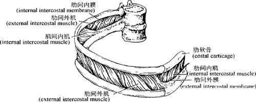 图3-19 膈肌(A、B) (2)肋间肌属胸固有肌:包括有肋间外肌(intercostales externi)、肋间内肌(intercostales interni)、肋间最内肌(intercostales intimi)等(图3-20)。其作用为上提或下降肋骨助呼吸。
