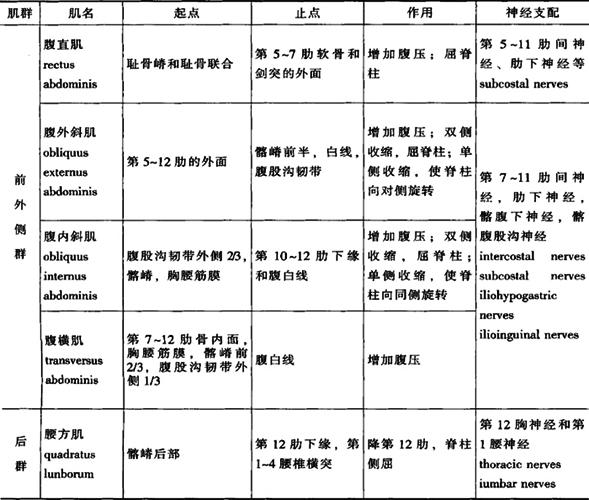 图3-20 肋间肌 4.腹肌 参与组成腹腔的前壁、侧壁和后壁。可分为前外侧群和后群。前外侧群主要有腹直肌(rectus abdominis)、腹外斜肌(obliquus externus abdominis)、腹内斜肌(obliquus inrernus abdominis)、腹横肌(transversus abdominis)、腰方肌(quadratus lumborum)。此群肌的主要功能具有保护、固定腹腔内脏器官的作用,收缩时缩小腹腔,增加腹压协助排便、呕吐和分娩。腹压增加还可使膈上升,协助呼气和咳嗽。腹肌收缩时可使脊柱前屈、侧屈和旋转,见表3-3(图3-18A)。 表3-3 腹肌