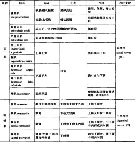 (二)头肌 头肌(muscles of head)分咀嚼肌和表情肌(面肌)两部分。 1.咀嚼肌(masticatory muscles) 包括咬肌(masseter)、颞肌(temporalis)、翼外肌(lateral pterygoid)、翼内肌(medial pterygoid)。它们都止于下颌骨,是运动颞下颌关节的肌肉,参加咀嚼运动,见表3-4(图3-18A)。 表3-4 头肌