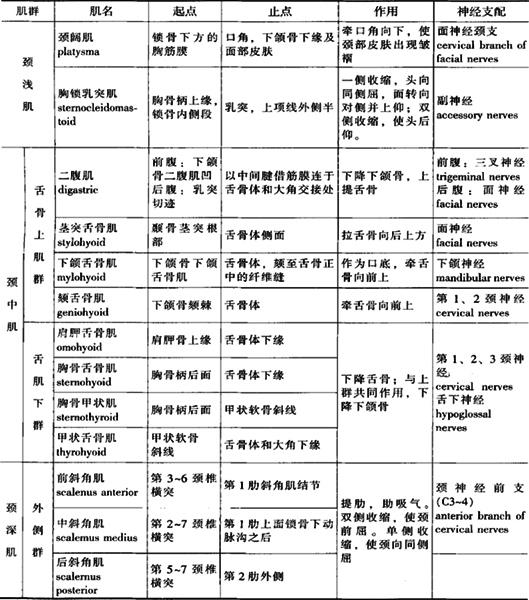 2.面肌(facial muscles) 是起自颅骨,止于面部皮肤,分布于孔裂周围的一些肌肉,有环形肌和辐射肌两种,收缩时使孔裂开大或闭合,同时牵动皮肤,显示出各种不同的表情,主要有眼轮匝肌(orbicularis oculi)、口轮匝肌(orbicularis oris)等,见表3-4(图3-18A)。 (三)颈肌 颈肌(muscles of neck)分浅、深两群(图3-18A)。 (1)浅层有颈阔肌(platysma)、胸锁乳突肌(sternocleidomastoid)、古骨上肌群(suprahyoid muscles)、舌骨下肌群(infrahyoid muscles)等。颈阔肌有紧张皮肤降口角作用。胸锁乳突肌一侧收缩使头向同侧倾斜,并使面转向对侧;两侧同时收缩使头后仰。舌骨上、下肌群有固定舌骨和喉或使之上下移动,配合张口、吞咽和发音等作用。 (2)深层主要有前斜角肌(scalenus anterior)、中斜角肌(scalenus medius)、后斜角肌(scalenus posterior)它们均起自颈椎的横突,前、中斜角肌止于第1肋,并与第1肋围成三角形间隙,称斜角肌间隙(interscalenius space),内有锁骨下动脉和臂丛神经穿过进入腋窝。三个斜角肌双侧同时收缩可提1~2肋,协助深吸气,单侧收缩可使颈侧屈,见表3-5。 表3-5 颈肌