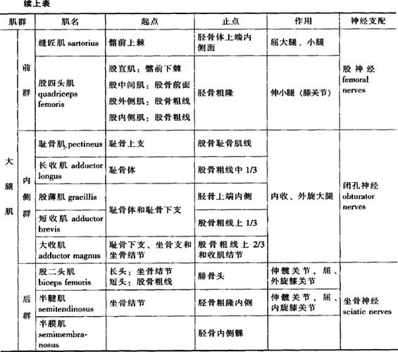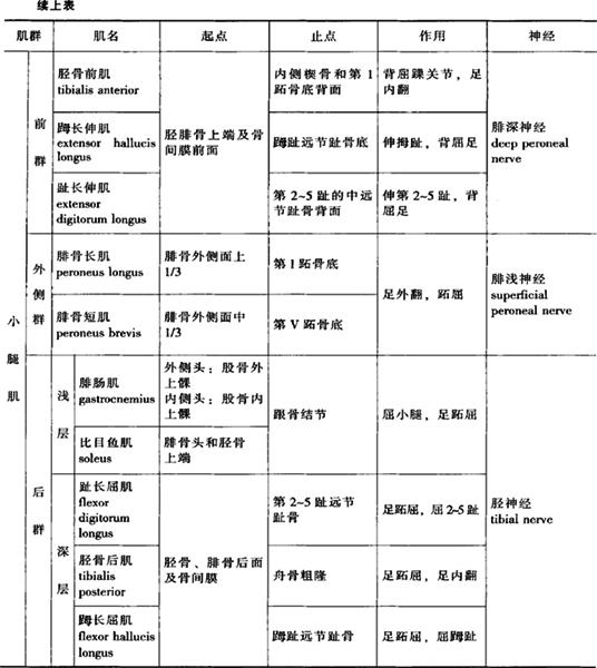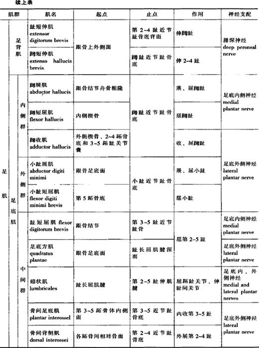 2.大腿肌 位于股骨周围,分前、后和内侧三群。前群,其功能主要伸膝关节、屈髋关节。内侧群位于大腿内侧,此群肌功能主要是内收和外旋大腿。后群,其功能主要屈膝关节,伸髋关节。 3.小腿肌 位于胫腓骨周围,分前、后、外侧三群。前群,位于小腿前部,此群肌的功能是使足背屈和足内翻。外侧群位于腓骨外侧,其主要功能为使足外翻和跖屈,此外对足弓的维持也起着重要作用。后群位于小腿后方,分浅、深两层,浅层:只有一块小腿三头肌(triceps surae),粗壮有力,它是腓肠肌(gastrocnmius)内、外侧头和比目鱼肌(soleus)的合称,其作用是提足跟,使踝关节跖屈,另外腓肠肌还可屈膝关节;深层:此层肌可屈趾、足跖屈和内翻。 4.足肌 分为足背肌和足底肌,足背肌包括 |