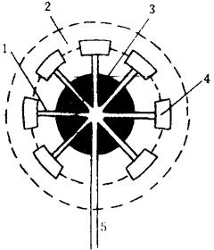 工业辐射温度计常以热电堆为探测元件。图4.3-5为透镜式辐射温度计原理图。图4.3-6为探测元件-热电堆的结构图。图4.3-7为双金属温度补偿器,补偿热电堆冷端温度变化时对示值的影响。