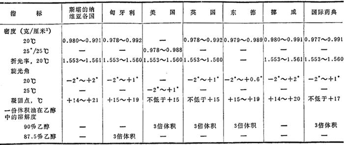 苏联用从越南进口原料生产的八角茴香油性质如下: 密度,克/厘米3,20°/20℃ 0.9750~0.9791 折光率,20℃ 1.552~1.554 凝固点,℃ 15~17 茴香脑含量,% 94~98 法国标准中(1),规定精馏的八角茴香油质量指标如下: 密度,克/厘米3,20°/20℃ 0.979~0.987 折光率,20℃ 1.5525~1.5560 凝固点,℃,不低于 15 根据ГОCT 3173-68规定,八角茴香油的质量指标应与茴香油质量指标相同(见10页)。 根据各国药典资料,八角茴香油的性质见表4.2。 表4.2 根据各国药典资料八角茴香油的物理化学指标