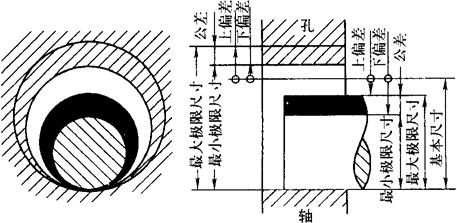| 释义 | 公差的概念 1.轴和孔的配合 两个基本尺寸相同的轴和孔,当装配在一起的时候,出现的松紧程度却不完全一样。有时松松地就能装上,有的则要用手锤敲进去,有时甚至要将孔零件加热使其膨胀,然后用力压进去。同样,在拆卸时也要花费不同的气力。 在机械加工中,控制零件的松紧程度靠什么来保证呢?这就是要说的公差。 2.基本尺寸、实际尺寸和极限尺寸 (1)基本尺寸 在图样中给定的整数尺寸就是基本尺寸,例如: (2)实际尺寸 工件加工后,用量具测量得到的尺寸称实际尺寸。加工中,由于量具误差、工件的温度和光洁程度以及测量准确度等方面因素的影响,测出的实际尺寸也难以反映出被加工工件的实际状态,所以这里说的实际尺寸是相对而言。 极限尺寸是以基本尺寸为基数来确定的。它给实际尺寸规定最大不能超过多少,即最大极限尺寸;最小不能少于多少,即最小极限尺寸,以这两个界限值对加工尺寸进行限定。 例如 3.极限偏差、尺寸公差和标准公差 (1)极限偏差 最大极限尺寸减去基本尺寸所得的代数差称上偏差,最小极限尺寸减去基本尺寸所得的代数差称下偏差;上偏差和下偏差统称为极限偏差。 上偏差和下偏差可以都是正数或负数,也可以是0,下偏差尺寸是0时,在图样上一般不标出。 (2)尺寸公差 就是常说的公差,是指允许尺寸的变动量,它等于最大极限尺寸与最小极限尺寸或上偏差与下偏差之间的代数差。上例中,工件的最大极限尺寸为55.02mm,它的最小极限尺寸为54.95mm,这时的上偏差为0.02mm,下偏差为-0.05mm,公差为0.02-(-0.05)=0.07(mm)。 图1-1所示表示了轴与孔或槽与榫凸凹配合的基本尺寸、极限尺寸的上述关系,也表明孔与轴或槽与榫配合公差间的关系。图中,由上偏差和下偏差的两条直线之间所限定的区域称公差带,图1-2所示是图1-1的公差带图。国家对构成孔、轴公差带的大小和位置分别进行了标准化。
