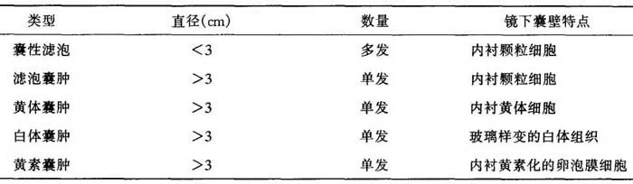 | 释义 | 六、卵巢瘤样病变 卵巢瘤样病变(tumor-like lesions of the ovary)可发生于任何年龄,病变常常因蒂扭转、出血、破裂而引发急腹症。临床和病理上也常误诊为真性肿瘤。 (一)与滤泡有关的囊肿 主要有以下5种:①囊性滤泡;②滤泡囊肿;③黄体囊肿;④白体囊肿;⑤黄素囊肿。五种囊肿的主要特点见表7-16。 表7-16 与滤泡有关的5种囊肿特点比较