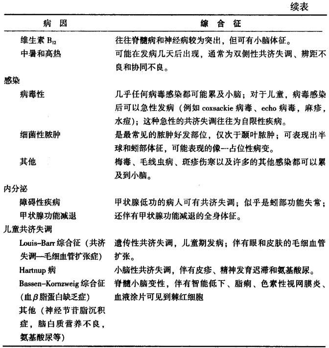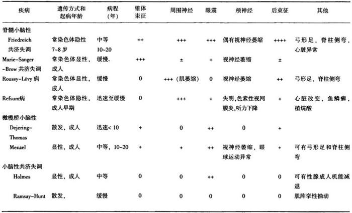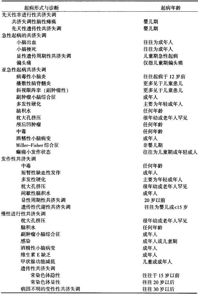 三、共济失调的症状与体征 起病年龄和形式 共济失调病人的起病年龄及起病的形式(急性、亚急性和慢性),对于鉴别诊断帮助很大,见表23-3。 表23-3 共济失调疾患的起病年龄和起病形式的鉴别诊断