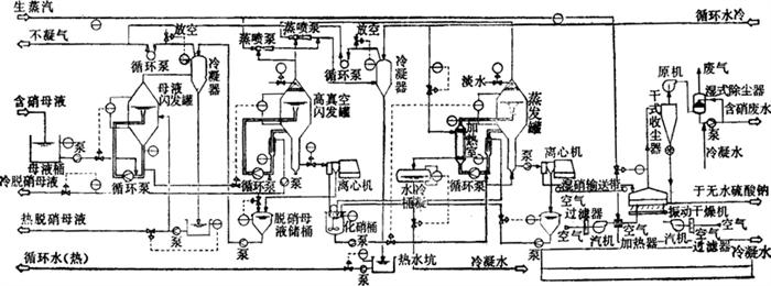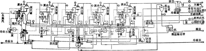 图3-4-22 硫酸钙卤水热压与多效蒸发制盐工艺流程示意图 (二)硫酸钠型卤水母液冷却法析硝制盐制硝工艺流程图例 见图3-4-23。