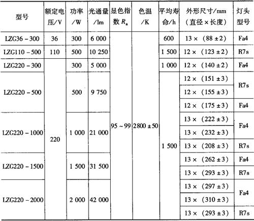 注:①双头接点的卤钨灯应水平安装使用,倾斜角不得超过4°,否则会缩短其使用寿命。 ②灯头和灯具的接触点应保持良好的电气接触,否则将使灯头严重气化,致使灯管封接处炸裂。 表9-19 OSRAM单端卤钨灯(220V、色温2900K)的主要技术数据